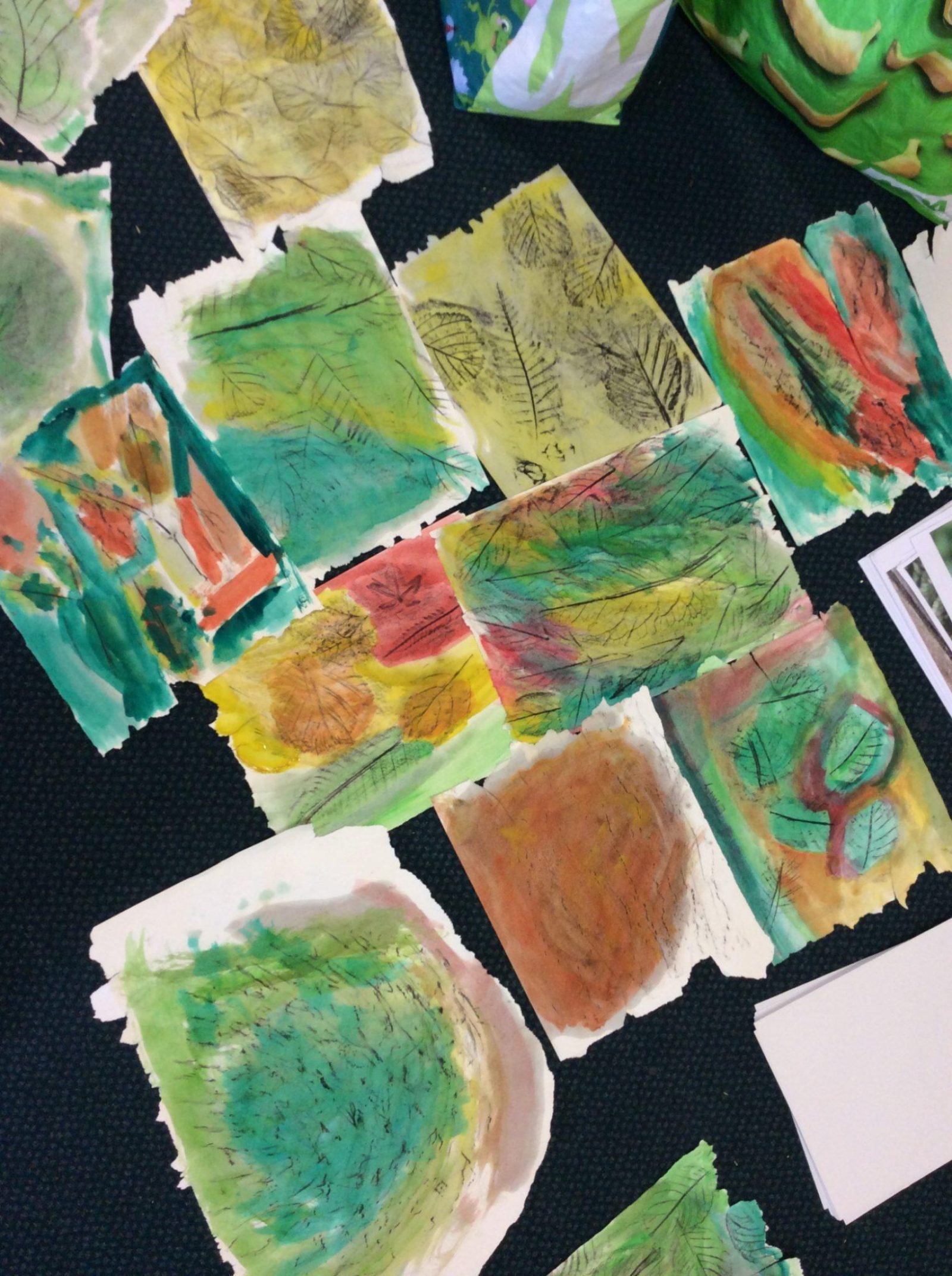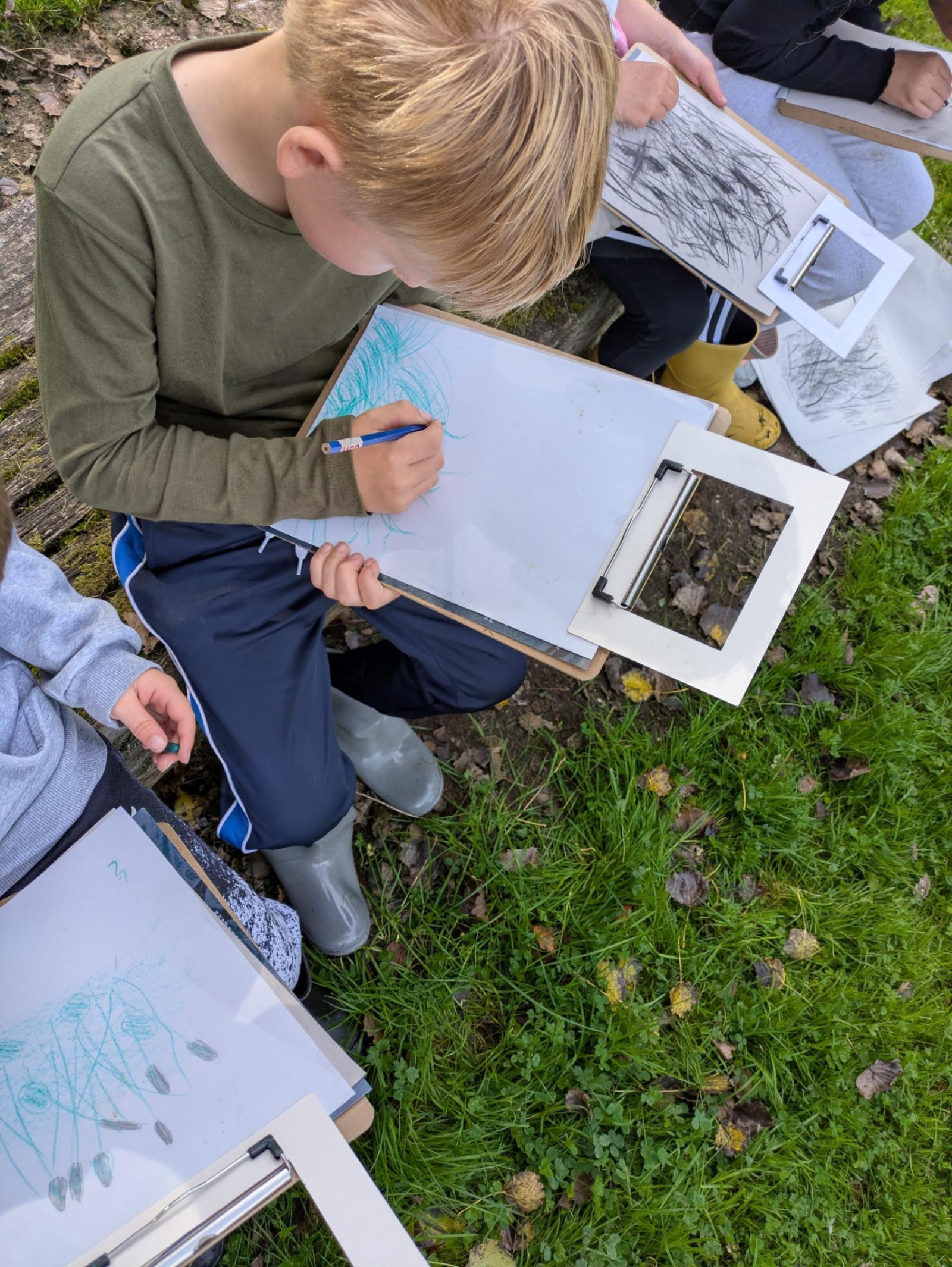 Exploring the river bank together we found fungi and fish, sticks and stones, colour, pattern and textures. Everyone had a go at developing new skills: making crayon rubbings with bark and leaves, charcoal and pencil drawing through a view finder to focus into detail.