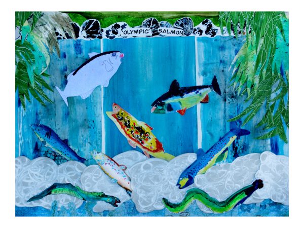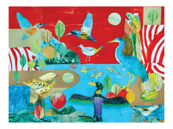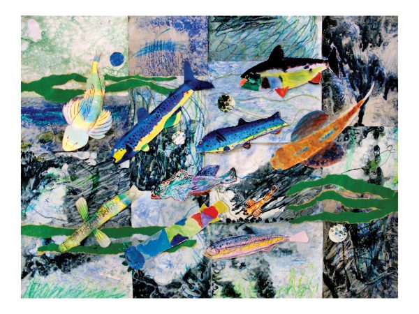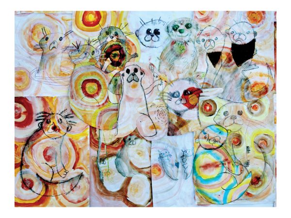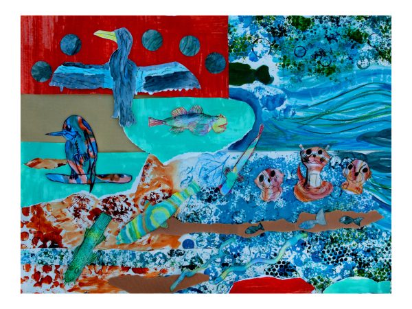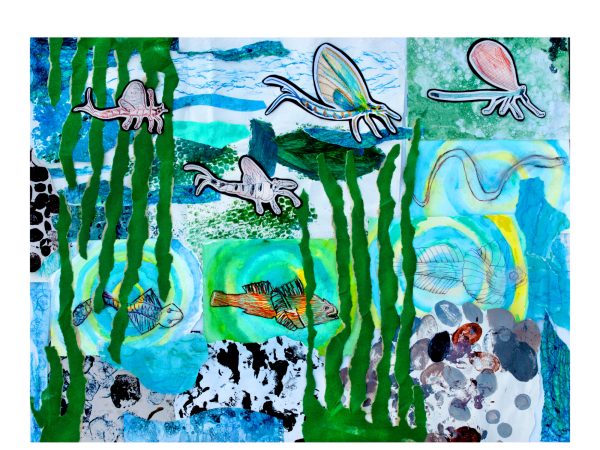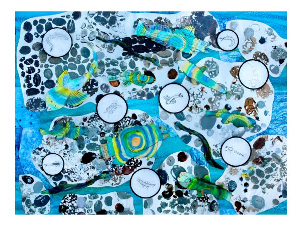 The vibrant collages were collaged using the artwork of more than 90 children aged 8 and 9 from Sidmouth and Sidbury Primary Schools, 23 participants from the Sid Valley Memory Café, 86 young attendees of the Sidmouth Science Festival, and 20 local residents.