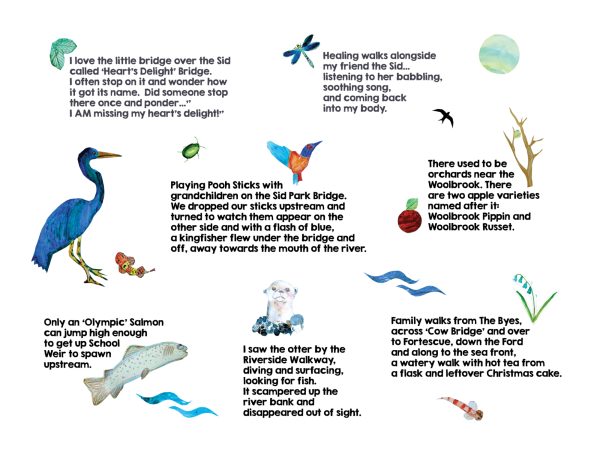 Creatively mapping stories, memories and awareness of the heritage, biodiversity and special place the river occupies in our community as part of the ecology of Sidmouth, we will create a public art exhibition to host this content.